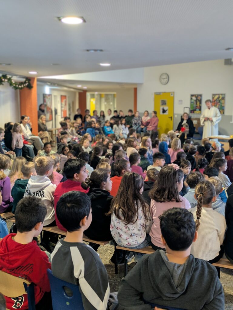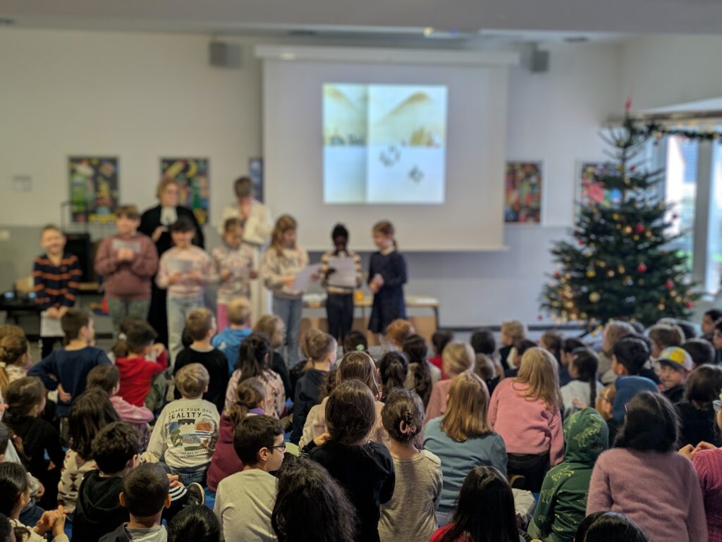 Am Donnerstag, 11.12. versammelten sich alle Schüler und Lehrkräfte der Grundschule Hillegossen in der Eingangshalle unserer Schule, um sich gemeinsam auf Weihnachten einzustimmen. Die diesjährige Adventsstunde wurde wieder geleitet von der evangelischen Pastorin Frau Féaux de Lacroix und der katholischen Jugendreferentin Frau Nolte, die diese Veranstaltung gemeinsam mit einigen Lehrkräften liebevoll vorbereitet haben. Die Viertklässler lasen eine Geschichte vor, in der es um ein rotes Paket ging, das von einem Menschen zum anderen weiter verschenkt wurde. Aber es war kein normales Geschenk, es beinhaltete nichts Materielles, sondern Glück, Zufriedenheit und Hoffnung. Jede Klasse erhielt im Anschluss ein solches rotes Paket mit kleinen Steinchen, die sie Personen schenken können, die Glück, Zufriedenheit oder Hoffnung brauchen. Eine schöne Geste zur Weihnachtszeit.