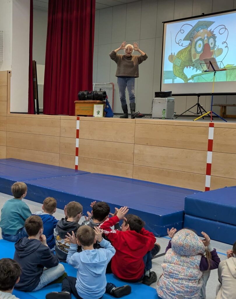 Den Erst- und Zweitklässlern erzählte Prawit die Geschichte eines sehr coolen Huhns, welches aus der Großstadt aufs Land zieht und dort allen erzählt, wie toll das Stadtleben ist. Das Lied vom Rap-Huhn, das viele aus dem Musikunterricht kennen, gemeinsam mit der originalen Stimme von Patricia Prawit zu singen, war für die Kinder ein tolles Erlebnis.
